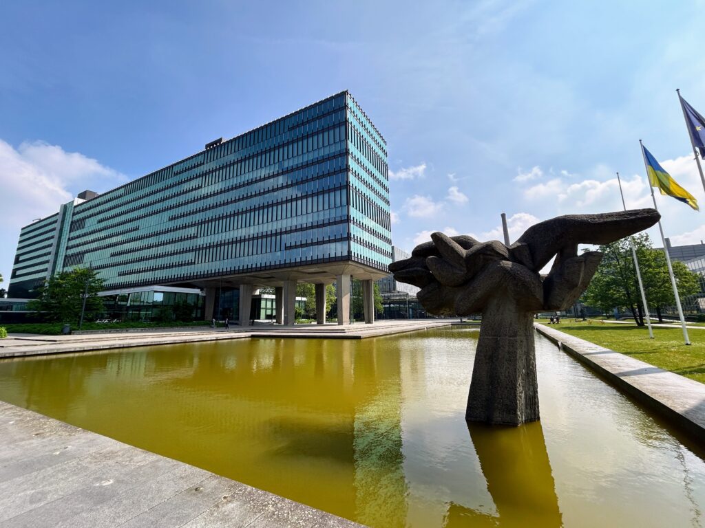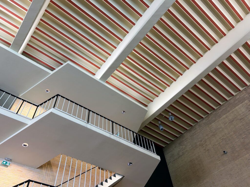 Northeast of the city center, the campus of TU Eindhoven is studded with several Modernist structures. Most striking among these is the Atlas Building. The structure was built between 1958 and 1963 and renovated for maximum energy efficiency in 2019, retaining its cathedral-like lobby and distinctive concrete supports. Nearby, concrete statues and picnic areas dot the landscape, bringing a bit of Brutalist ornament to the grassy center of campus.