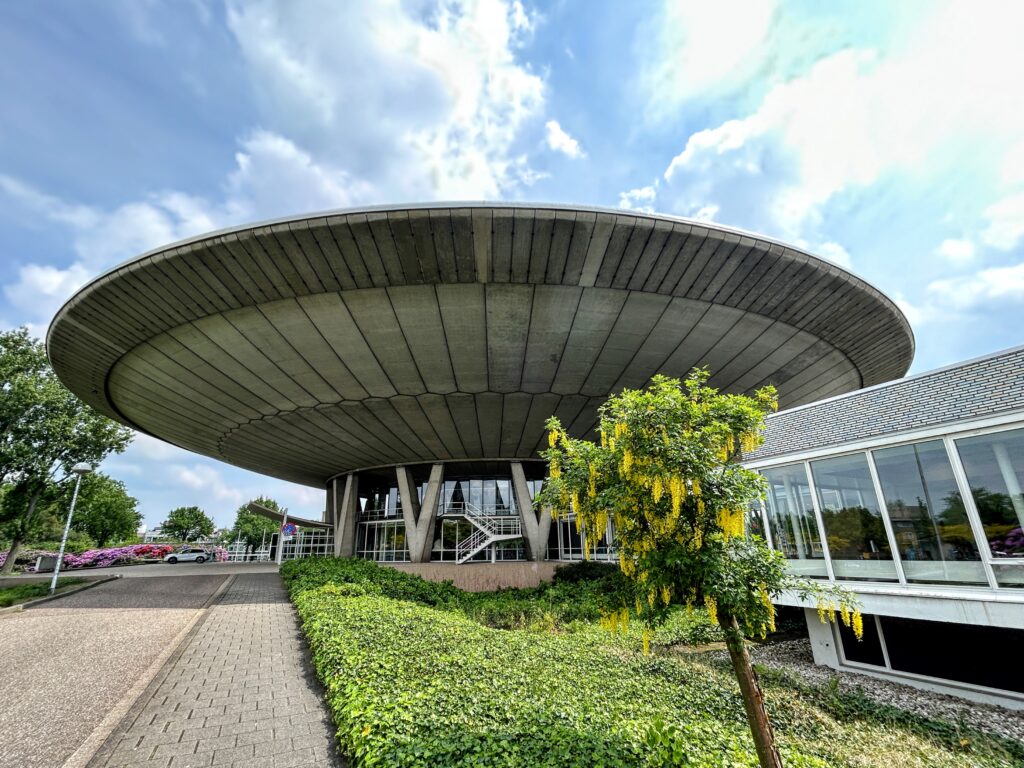 One of the stranger manifestations of Philips’ postwar architectural legacy is the flying saucer-shaped Evoluon, built in 1966 as a conference center. The building remains in use as a museum, and continues to project retro space-age weirdness in its saucer-shaped planters and atom-branded door handles.
