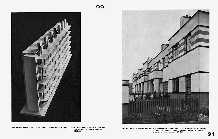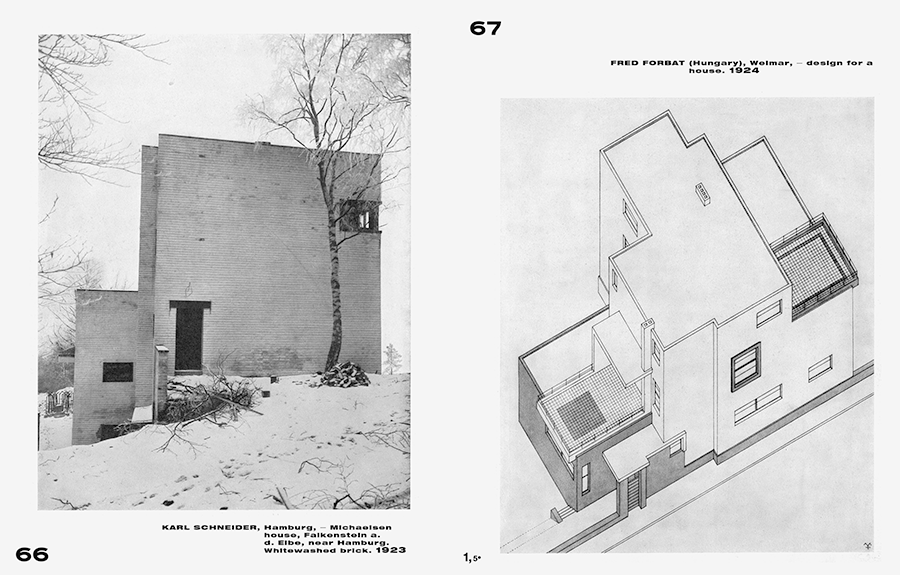 International Architecture, the initial title in the Bauhausbücher series, serves as a manifesto of sorts for editor Walter Gropius. Its general subject asserts the primacy of architecture over the other disciplines covered by the Bauhaus, and the specific structures he chooses are unerringly contemporary—some so new they are unbuilt, existing only as sketches or models. Gropius’ introduction leaves no room for ambiguity about his commitment to contemporaneity and a twentieth-century “living” architecture, disparaging the remnants of the 19th century which in his words: